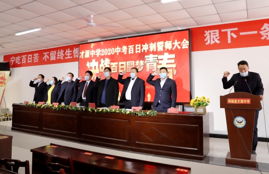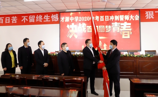 誓師大會現(xiàn)場,才源中學(xué)校長張醒民向九年級階段負(fù)責(zé)人授戰(zhàn)旗。師生代表面對直播鏡頭向全體初三師生發(fā)出鏗鏘誓言,號召大家奮勇爭雄,2020年再奪中考全市領(lǐng)先的佳績。誓詞為:凌志擎天,豪氣滿懷;天道酬勤,樂戰(zhàn)不??;意堅心恒,信念常在;以我雄心,征戰(zhàn)未來;沖刺百日,只為無悔青春;人生綻放,定是風(fēng)雨兼程;今日苦讀書厲兵秣馬,明朝進(jìn)重點(diǎn)吐氣揚(yáng)眉。
