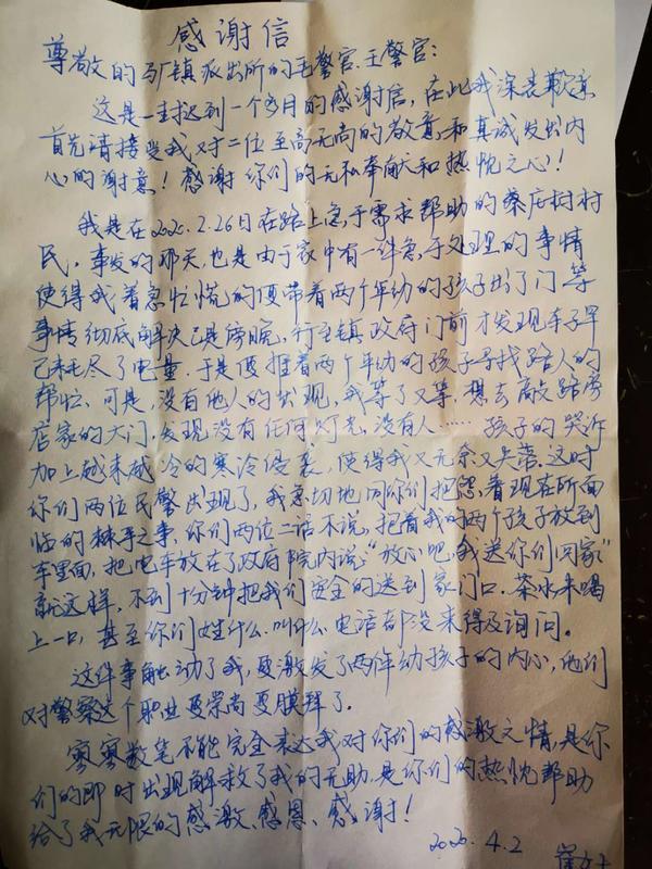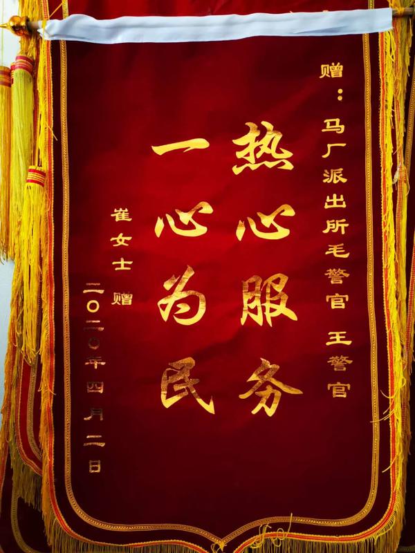 為向民警致謝,崔女士家人多次聯(lián)系馬廠派出所所長(zhǎng)毛衛(wèi)庚說(shuō)要表示感謝,都被婉言謝絕了。近日,已身在鄭州打工的崔女士每次想到那晚民警們對(duì)她們的幫助都心存感激,于是她就手寫(xiě)了一封感謝信,并制作了一面錦旗,從鄭州郵寄到家里,讓親戚幫忙送到馬廠派出所以示感謝。