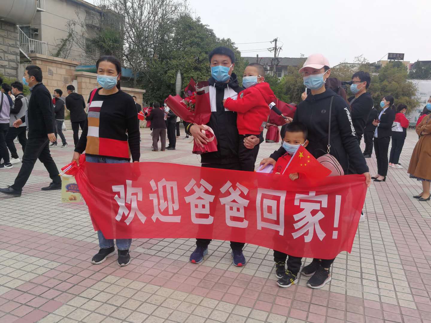 “歡迎爸爸回家”、“歡迎回家” 親人們、同事們、朋友們和自發(fā)趕來的市民早早守候在隔離休整點門口,等著迎接英雄回家。一束束鮮花、一條條橫幅都在向凱旋而來的勇士們表達著敬意和思念。