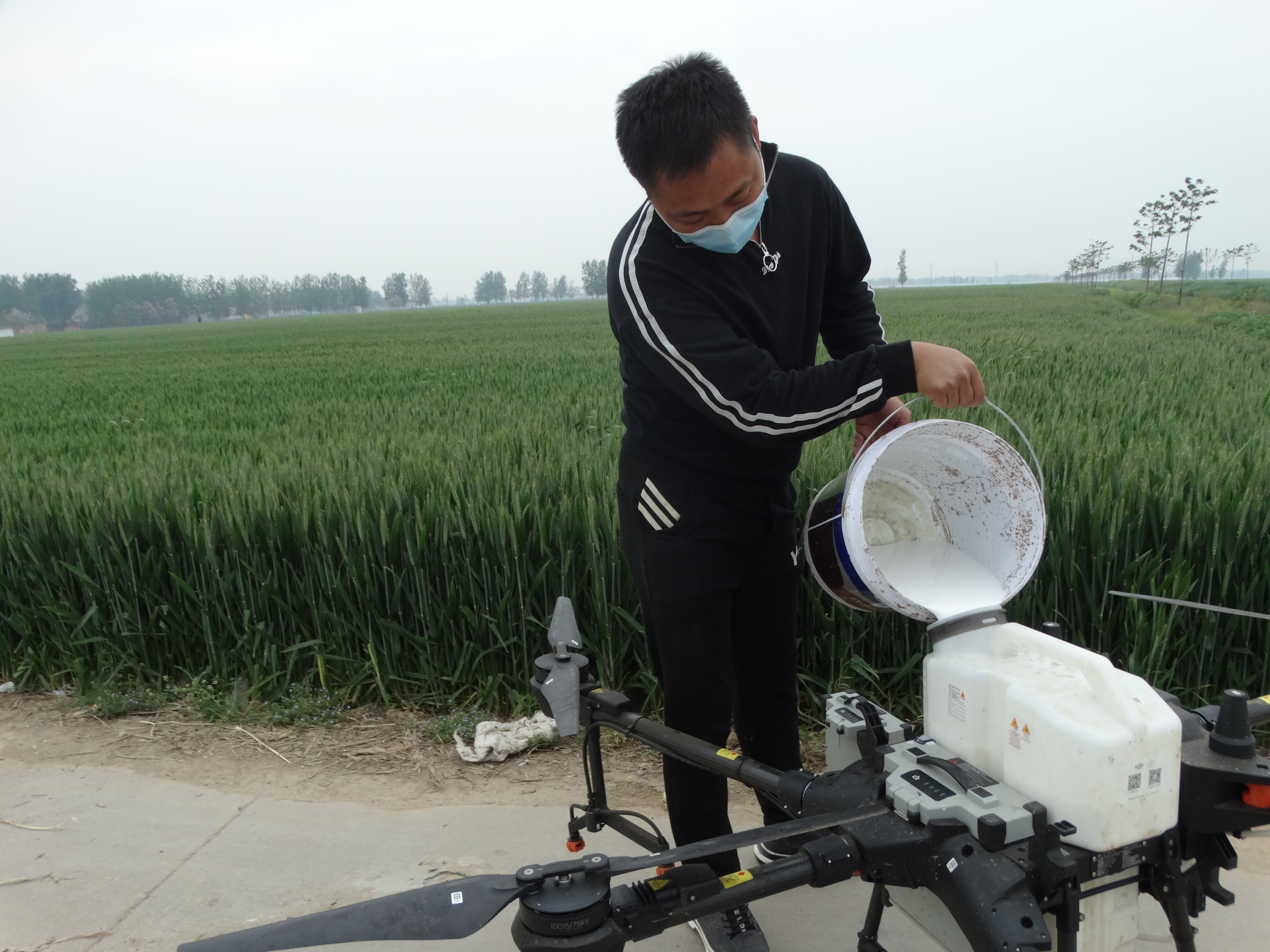4月18日,沈丘縣周營鎮(zhèn)王寨村小麥高產(chǎn)示范基地,飛防技術人員在操作無人機進行“一噴多防”作業(yè),噴施“防治病蟲害+強筋壯骨增產(chǎn)營養(yǎng)液”套餐。