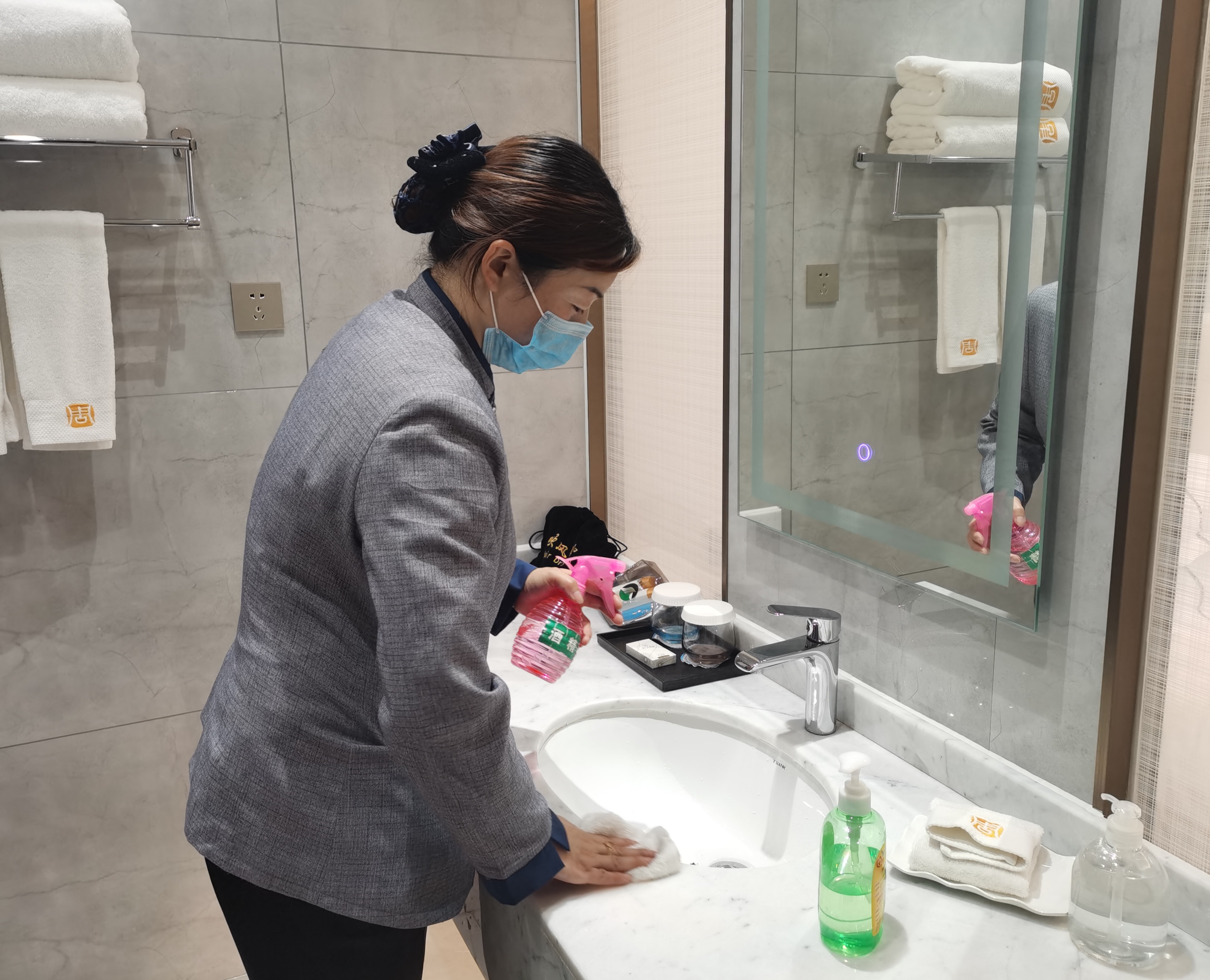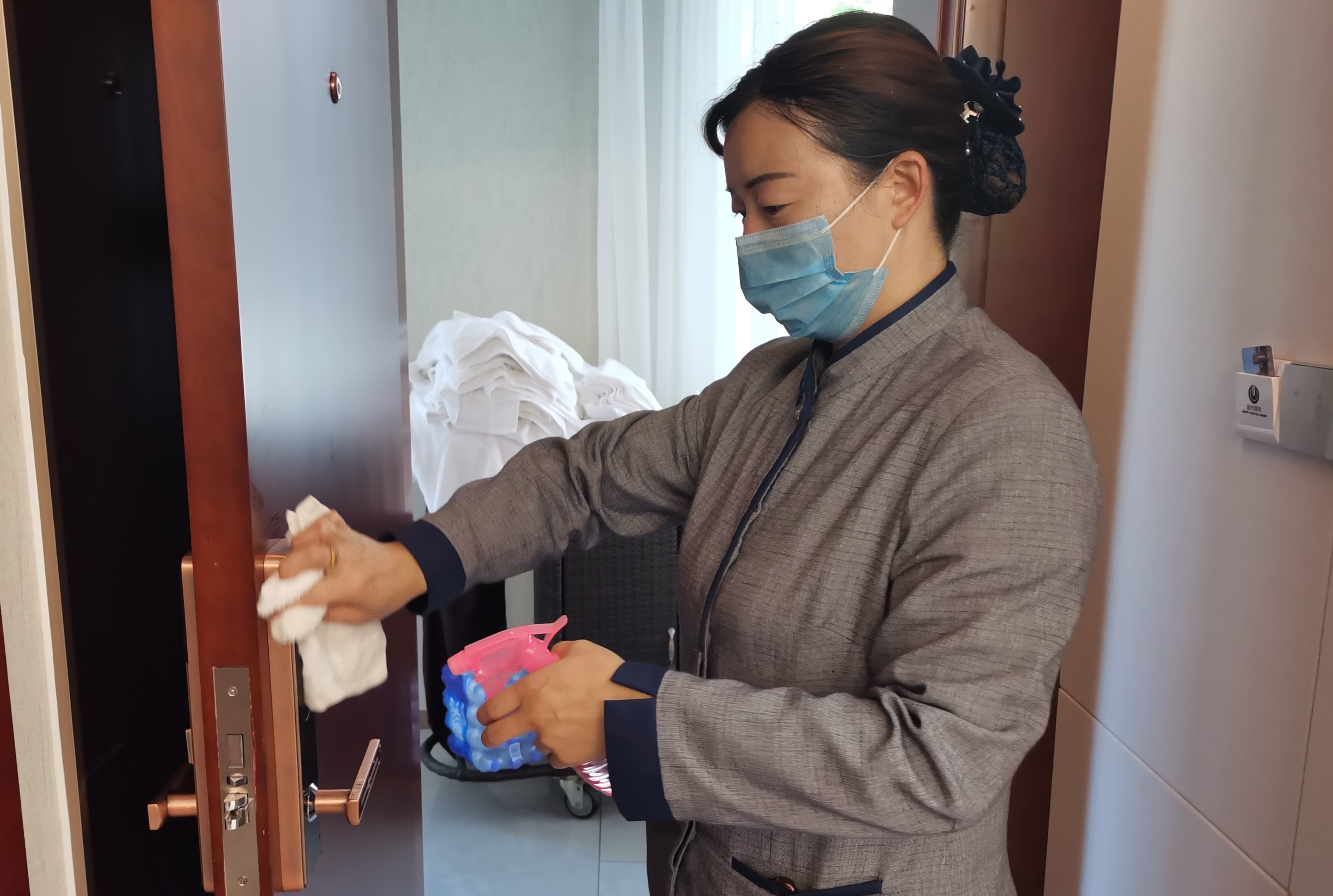 5月10日,記者在“兩會(huì)”駐地酒店看到,酒店工作人員不時(shí)對(duì)客房和公共場(chǎng)所、會(huì)議室進(jìn)行消毒、擦拭。受疫情影響,“兩會(huì)”駐地酒店工作人員認(rèn)真和精心準(zhǔn)備,加強(qiáng)了對(duì)代表、委員駐地消殺防疫,還貼心地放置了一次性電梯按鍵專用紙、酒精等物品。