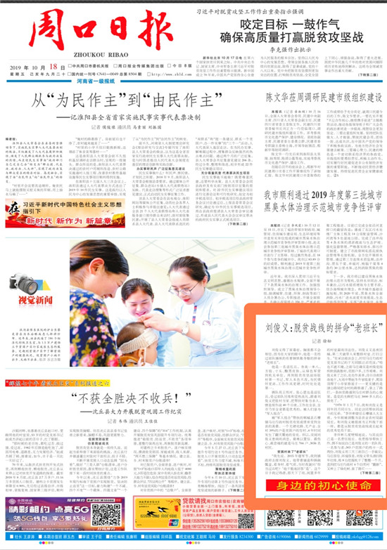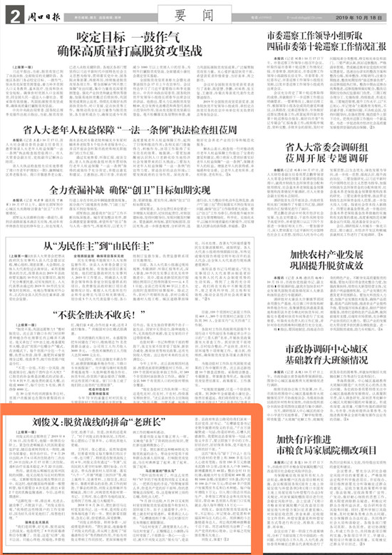 2019年10月18日,《周口日報》頭版轉(zhuǎn)版,以《劉俊義:脫貧戰(zhàn)線的拼命“老班長”》