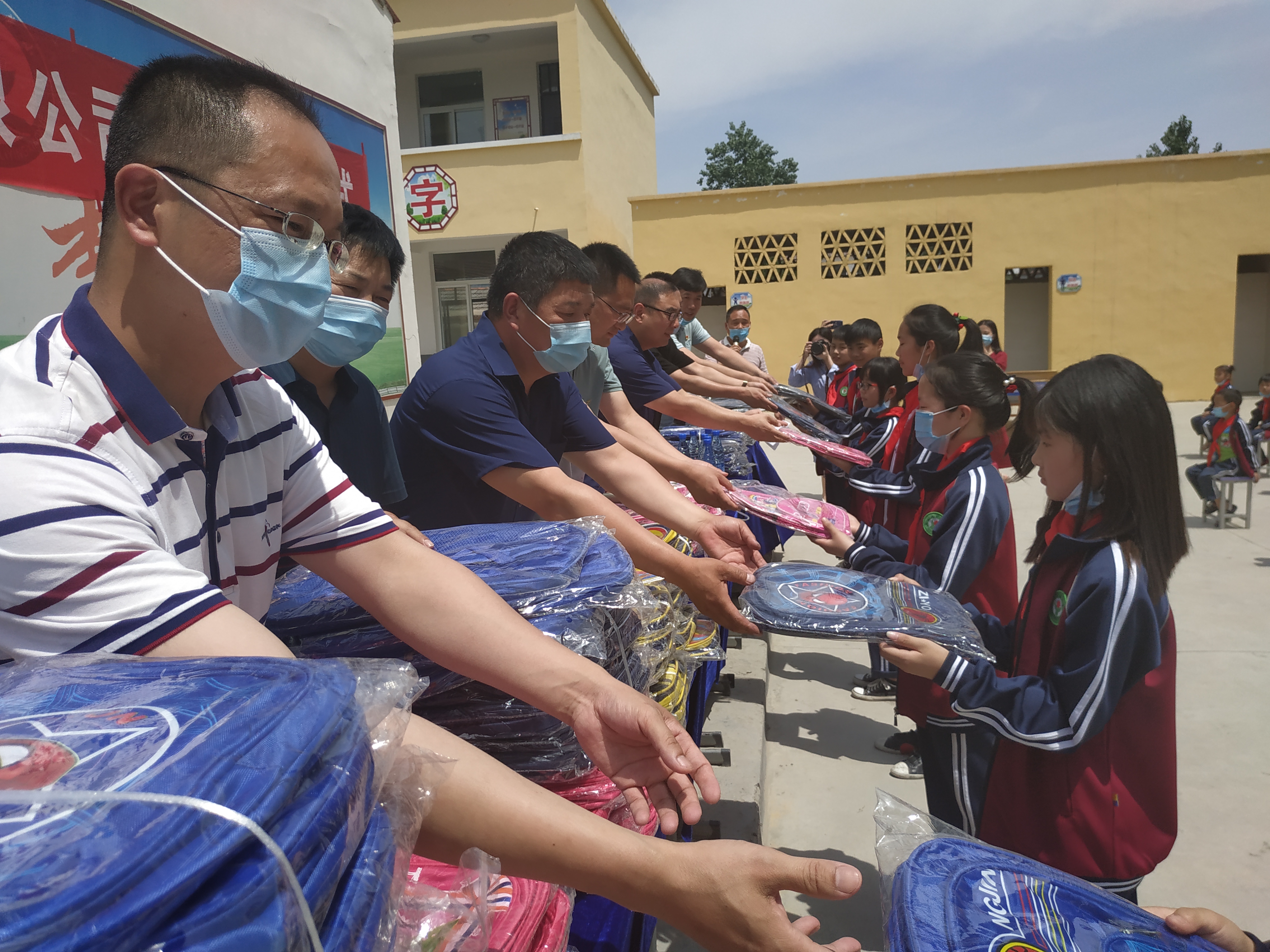 5月21日,河南同和堂醫(yī)藥有限公司與部分周口愛心人士,穿過滾滾麥浪,來到市醫(yī)保局定點(diǎn)扶貧村——項(xiàng)城市新橋鎮(zhèn)北李營行政村,為村小學(xué)的學(xué)生們送去200個(gè)書包,向他們提前送上六一兒童節(jié)的祝福。