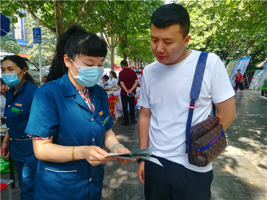 活動現(xiàn)場,參加宣傳活動的各單位工作人員為市民散發(fā)宣傳相關(guān)資料,并為市民進行義診。