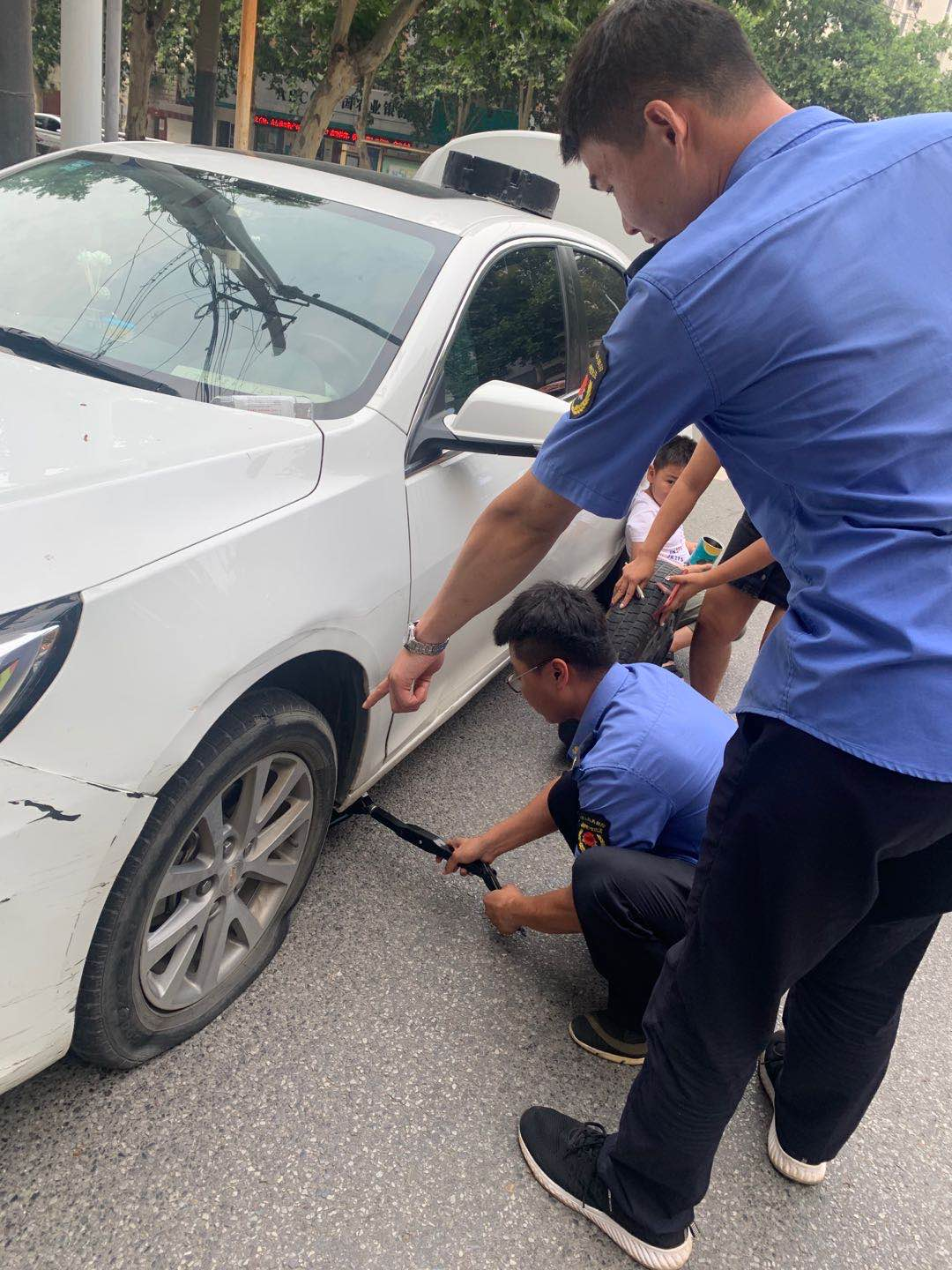 當(dāng)時(shí),城管隊(duì)員上前查看發(fā)現(xiàn),車輛左前輪爆胎,一位女車主正在車邊焦急地徘徊,車內(nèi)還有一兒童,因天氣炎熱,焦躁不安。