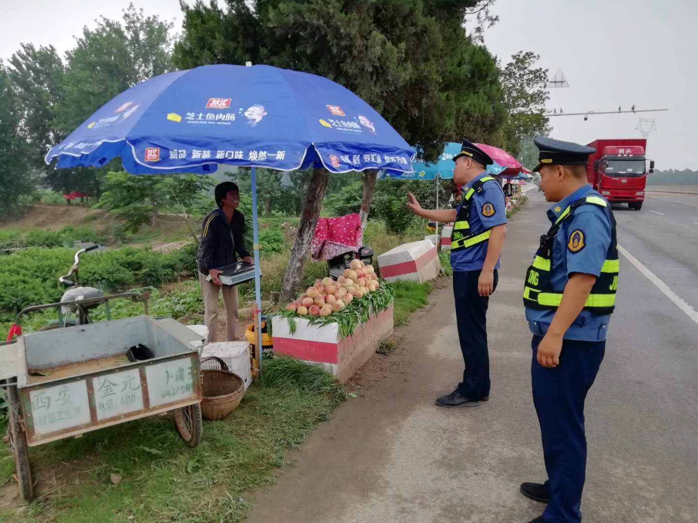 隨著瓜果等農(nóng)產(chǎn)品陸續(xù)上市,龍?jiān)绰犯浇芏啻迕裰苯影压瞎逊旁诠愤吷险嫉澜?jīng)營,給道路交通帶來嚴(yán)重的安全隱患。通過勸導(dǎo)、宣傳教育,提高了沿線經(jīng)營戶對(duì)違章占用公路擺攤設(shè)點(diǎn)危害性的認(rèn)識(shí),自覺將攤點(diǎn)撤離公路至安全地帶,確保了沿線公路的安全暢通。