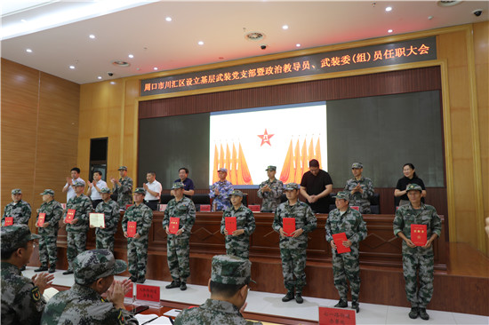 黨管武裝建設國防,軍民攜手共筑長城。為健全武裝工作組織領導體系為推動國防動員和后備力量建設在基層末端落實,7月16日上午,周口市川匯區(qū)召開基層武裝黨支部暨政治教導員、武裝委(組)員任職大會。周口軍分區(qū)司令員湯維政,區(qū)委書記、區(qū)人武部黨委第一書記李宗喜,周口軍分區(qū)政治工作處主任李揚,市委組織部副處級調研員宋陽,區(qū)人武部政委高新傳、部長陳繼芳及城鄉(xiāng)一體化示示范區(qū)、經(jīng)濟開發(fā)區(qū)、港口物流產(chǎn)業(yè)聚集區(qū)等有關負責同志參加了大會。會上設立了18個基層武裝黨支部,任命了15名基層武裝部政治教導員、20名村(社區(qū))武裝委(組)員任職命令,武裝部政治教導員、武裝預建黨支部書記和兼職武裝委(組)員代表先后作了履職承諾發(fā)言,湯維政等為新任命的人員頒發(fā)了任職證書。