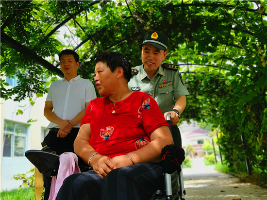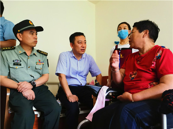 走進(jìn)位于太昊路上的周口市老年護(hù)理院,院內(nèi)整潔有序、花蕊吐香鳥鳴聲聲,小徑通幽處的涼亭內(nèi)三五老人打牌、聊天,一副愜意安詳?shù)纳顖鼍啊T诤顕I(lǐng)母親王玉勤居住的房間內(nèi),李揚(yáng)、孫光濤等人坐在床邊與她聊天談心,看到這么多人來慰問她,王玉勤眼中流下了感動(dòng)的眼淚,她對慰問人員表示感謝,說自己來護(hù)理院近一年來,吃住條件都不錯(cuò),護(hù)理院照顧的無微不至,身體一天天恢復(fù),閑暇時(shí)還能不依賴輪椅自己走上一段路。她激動(dòng)地說:“感謝黨和政府的親切關(guān)懷,我最大的愿望是希望倆兒子永遠(yuǎn)聽黨的話,在部隊(duì)安心服役、再立新功,用優(yōu)異的成績回報(bào)黨和政府對我們?nèi)业年P(guān)愛?!?/p>