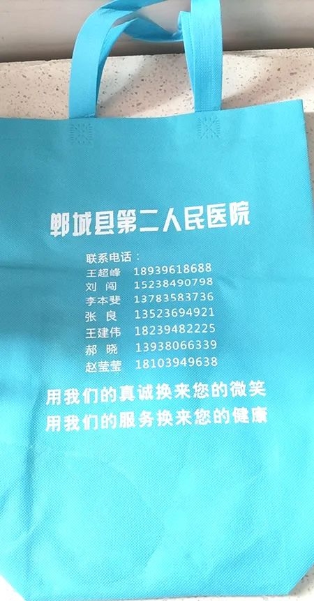 送患者手提袋,等于送上了放大號(hào)的醫(yī)生名片,方便了更多的留守在家的空巢老人,讓更多患者實(shí)現(xiàn)足不出戶就可以聯(lián)系到免費(fèi)的“家庭醫(yī)生”,得到正確及時(shí)的用藥指導(dǎo),從而有效降低了急病、突發(fā)病的發(fā)生,受到群眾好評(píng)。