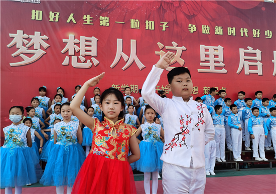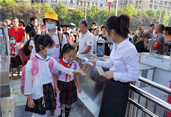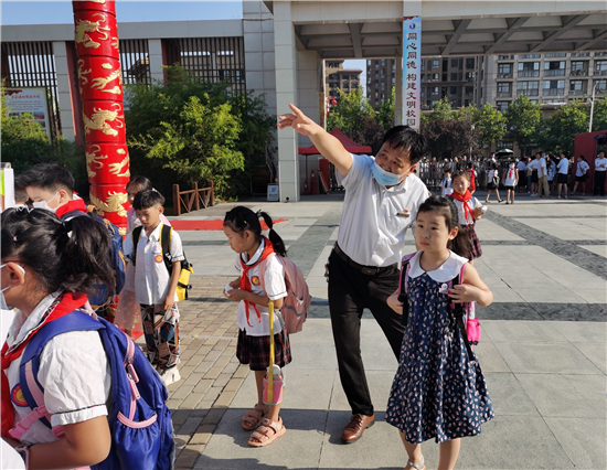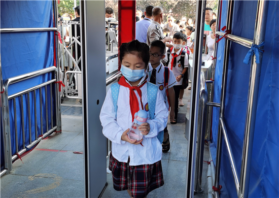 9月7日早上,周口市文昌小學的學生有序排隊測量體溫后進入學校。據文昌小學校長介紹,全市中小學實行錯峰開學。今天是小學開學時間,文昌小學學生每個年級實行錯時上下學,學生入校要測體溫,并為一年級新生舉辦了主題為“夢從這里啟航”的“迎新儀式”。