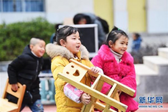 重慶市石柱土家族自治縣中益鄉(xiāng)小學的同學們搬著小椅子前往操場觀看文藝表演。當日,“我的中國夢——文化進萬家”中國視協(xié)文藝志愿服務小分隊走進中益鄉(xiāng)小學,為師生們帶來精彩的文藝表演(2019年12月12日攝)。新華社記者王全超 攝