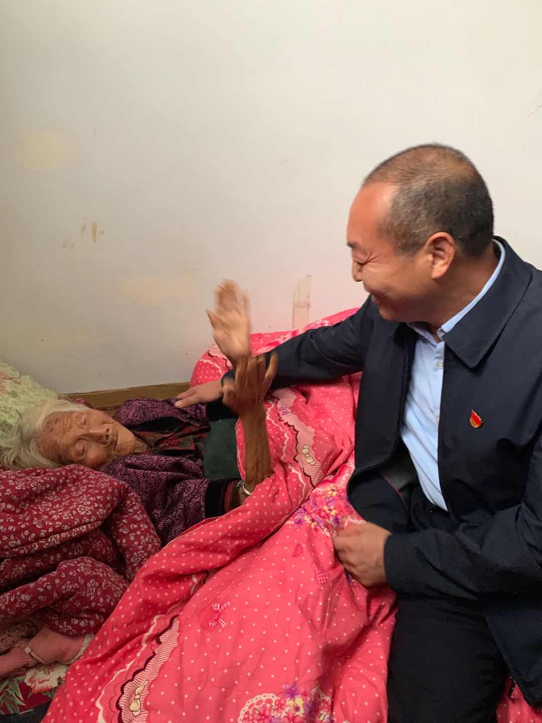這天,方凱一行帶著嶄新的棉衣、大米、食用油等禮品,首先來到磨臺村看望107歲的老人胡有蘭。躺在床上的老人雖年逾百歲,一眼看見方凱,就認出來了,激動地說:“孩子,你又來了?”說著,就急忙拉住方凱的手,緊緊地握著??蠢先瞬环奖阕饋?,方凱便坐在老人身邊,笑著說:“是的。娘,兒子來看您啦!”