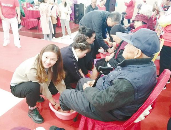 重陽節(jié)當(dāng)天,周口市總工會、周口市教體局、川匯區(qū)供銷社在鴻運酒店舉辦“九九重陽節(jié) 濃濃敬老情”孝老愛親活動,邀請200多名社區(qū)老年人及家屬參加。活動現(xiàn)場,家屬為老人進行了洗腳(如圖),主辦方安排了精彩的文藝演出,博得觀眾陣陣掌聲,讓社區(qū)老人過了一個歡樂祥和的重陽節(jié)。