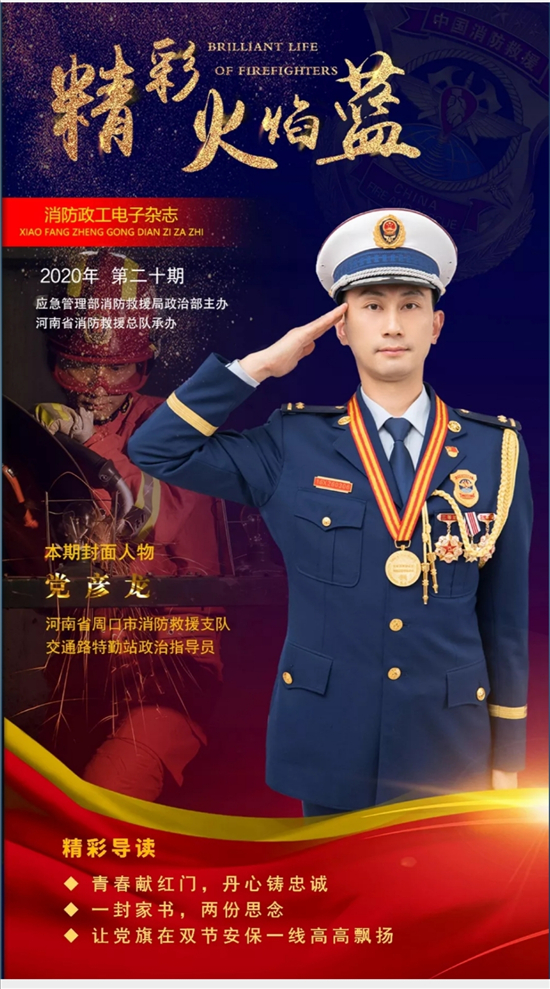 在最近一期《精彩火焰藍》電子雜志上,封面人物是來自周口消防救援支隊交通路特勤站政治指導員黨彥龍。該電子雜志封面人物主要介紹 “河南省最美消防人”、“河南省人民滿意的政法干警”、河南省“優(yōu)秀人民警察”等優(yōu)秀人物。