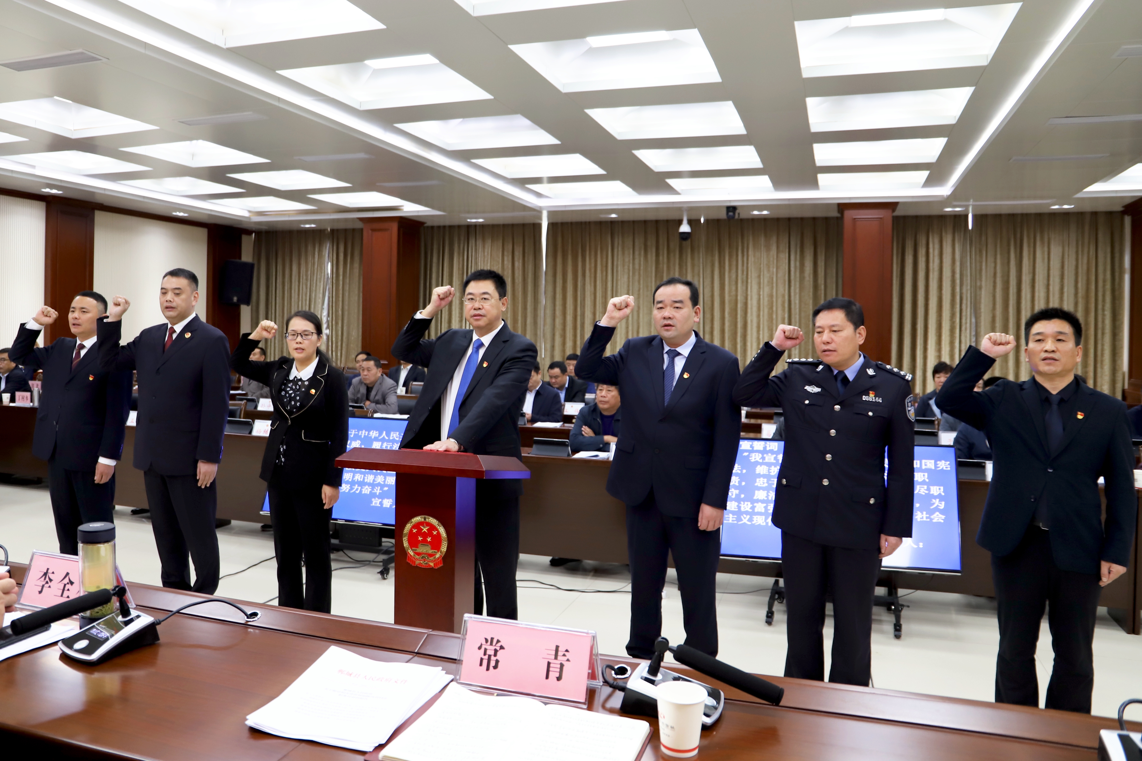 李建軍向新任命同志頒發(fā)任命書;在縣人大常委會組成人員監(jiān)誓下,新任命的同志由常青領誓向憲法進行了宣誓。