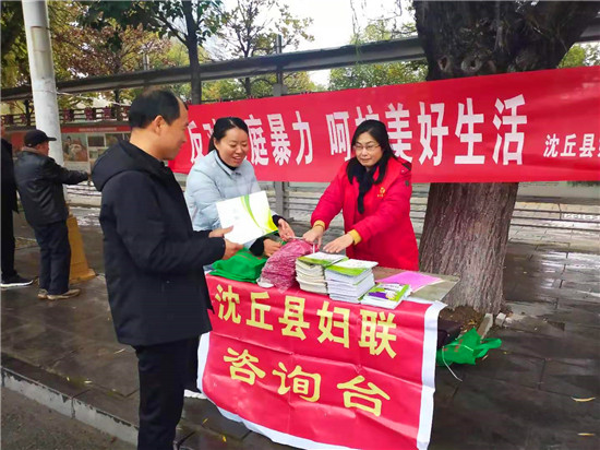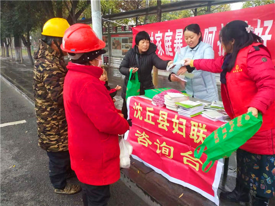 11月25日是國(guó)際反家庭暴力日。為進(jìn)一步提高全社會(huì)反家庭暴力意識(shí),加大對(duì)《反家庭暴力法》的宣傳,有效預(yù)防和制止家庭暴力,促進(jìn)家庭和諧,保障婦女群眾在婚姻家庭中的合法權(quán)益。為此,沈丘縣婦聯(lián)在城區(qū)組織開展了以“反對(duì)家庭暴力,呵護(hù)美好生活”為主題的法治宣傳活動(dòng)。