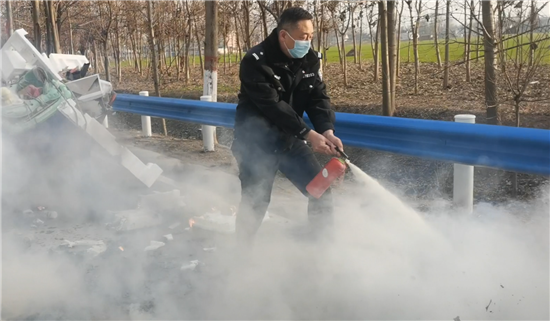 當日下午4點左右,太康縣交警大隊二中隊指導員南應開及輔警郭旗全、魯?shù)?、尹晨豪正在趙堂村附近巡邏時,猛然看到前方一輛電動三輪車上有煙氣冒出,巡邏民警加速趕到。原來是一名老漢的一輛拉著廢舊紙箱的電動三輪車著了火,一車廢紙和塑料瓶散落一地正在燃燒,火越燒越旺,只見老漢正在手忙腳亂地滅火。這輛三輪車上拉的全是廢塑料、硬紙殼等易燃物,而且當時正刮著風,如果不及時滅火任由火勢蔓延,后果將不堪設(shè)想。看到此情況后,南應開迅速從警車上拿出滅火器秒變“消防員”,對著起火的物品進行滅火操作,同時安排輔警對過往行人和車輛進行疏導。由于發(fā)現(xiàn)和撲救及時,在民警的緊急救援下,火源很快被眾人合力撲滅。對太康交警面對火情臨危不亂、果斷處置、幫助群眾的行為,老漢車主和過往群眾紛紛點贊。②6