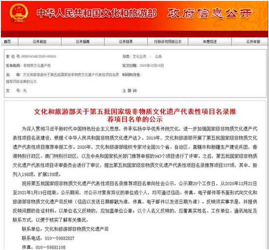 據(jù)了解,2019年,文化和旅游部開展了第五批國(guó)家級(jí)非物質(zhì)文化遺產(chǎn)代表性項(xiàng)目推薦申報(bào)工作。2020年,文化和旅游部組織專家對(duì)全國(guó)31個(gè)省、自治區(qū)、直轄市和新疆生產(chǎn)建設(shè)兵團(tuán),香港特別行政區(qū)、澳門特別行政區(qū),以及中央和國(guó)家機(jī)關(guān)部門推薦申報(bào)的943個(gè)項(xiàng)目進(jìn)行了評(píng)審。之后,第五批國(guó)家級(jí)非物質(zhì)文化遺產(chǎn)代表性項(xiàng)目評(píng)審委員會(huì)進(jìn)行了審議,提出第五批國(guó)家級(jí)非物質(zhì)文化遺產(chǎn)代表性項(xiàng)目名錄推薦項(xiàng)目337項(xiàng),其中,新列入198項(xiàng),擴(kuò)展139項(xiàng)。
