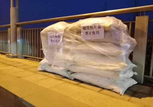 12日28日晚,記者在周口大道橋上看到,橋的兩側放置了五六堆融雪劑,以應對即將到來的雨雪天氣,防止橋面結冰給車輛和行人造成不便,此舉受到路過行人一致好評。