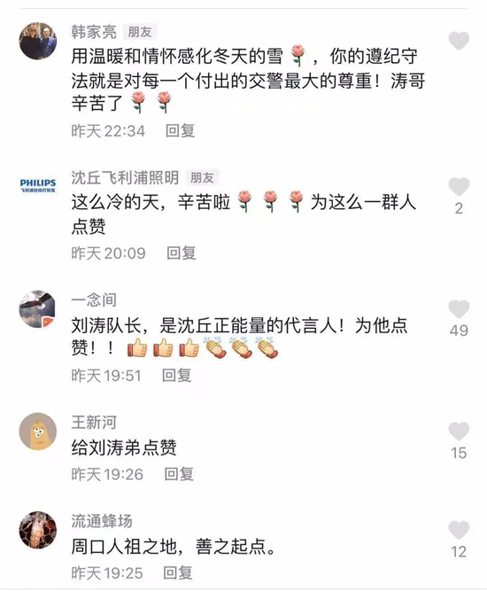 2021年元旦,記者聯(lián)系聯(lián)系上了視頻中的主人公——沈丘縣交警大隊(duì)城市中隊(duì)劉濤中隊(duì)長(zhǎng),雖然是元旦假日,他依然堅(jiān)守在崗位上,他告訴記者,這是一名交警工作的日常,沒有想到自己和同事們的一個(gè)小舉動(dòng)能獲得無數(shù)網(wǎng)友好評(píng),這給了他們?cè)谝院蠊ぷ髦懈蟮膭?dòng)力,劉濤表示,風(fēng)雪無阻,滾滾車流中,他將為全縣人民的安全出行繼續(xù)堅(jiān)守崗位。