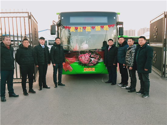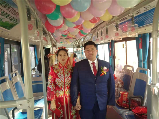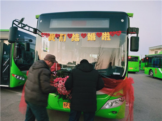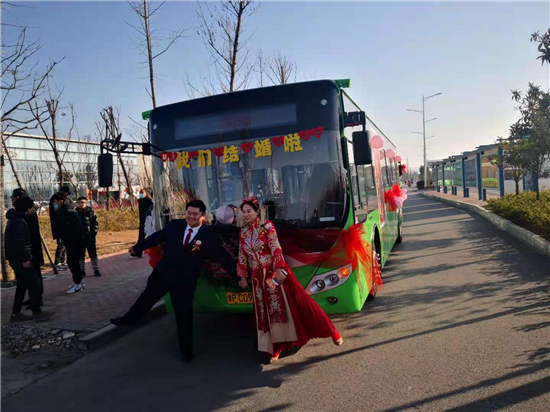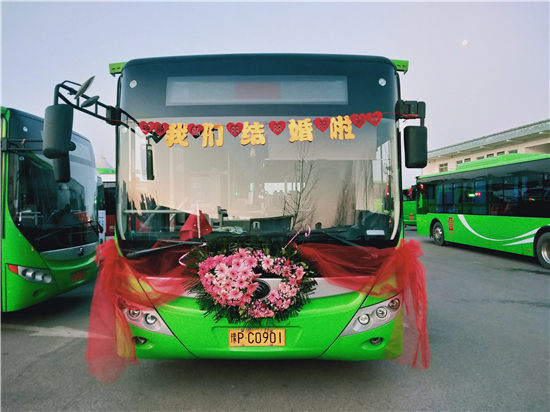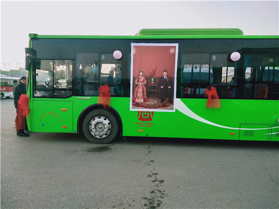 1月1日早上,裝飾一新的6輛迎親公交車吸引了眾人的目光。周口公交一公司19路公交車司機(jī)、新郎買亞飛用公交車,迎娶同為公交車司機(jī)的新娘裴丹陽(yáng),被當(dāng)作婚車的公交車為新能源車,正是新郎和新娘平時(shí)駕駛的19路和9路公交車,以及15路公交車。整個(gè)婚禮,親朋好友都是乘坐公交車趕往婚禮現(xiàn)場(chǎng),環(huán)保又有新意。