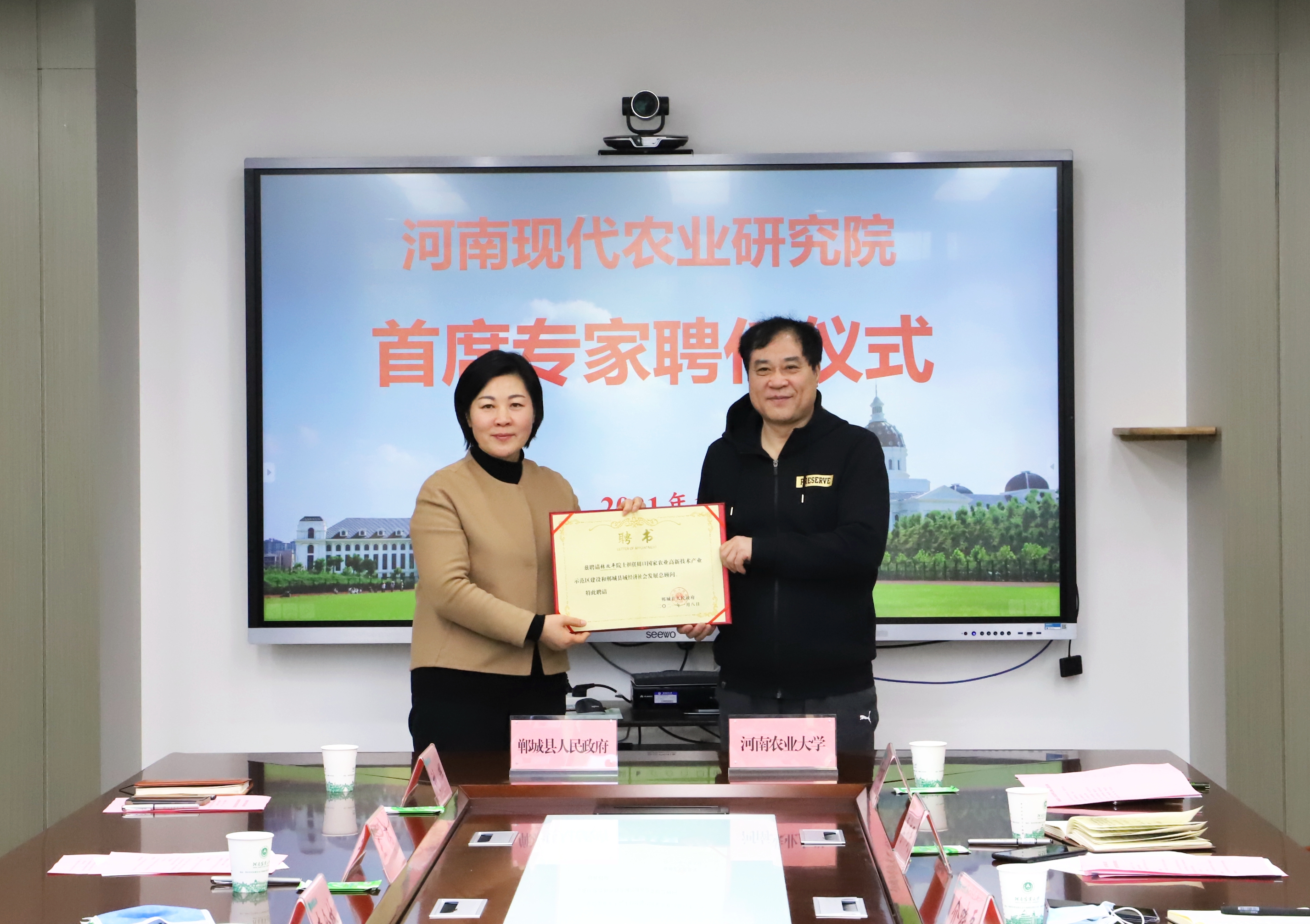 鄲城縣聘請河南農(nóng)業(yè)大學有關(guān)專家組成“河南現(xiàn)代農(nóng)業(yè)研究院首席專家團”。羅文閣向張改平發(fā)放周口國家農(nóng)業(yè)高新技術(shù)產(chǎn)業(yè)示范區(qū)建設和鄲城縣域經(jīng)濟社會發(fā)展總顧問聘書,李全林、介曉磊共同簽署了共建河南現(xiàn)代農(nóng)業(yè)研究院備忘錄,李全林向河南現(xiàn)代農(nóng)業(yè)研究院9位首席專家發(fā)放聘書。