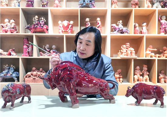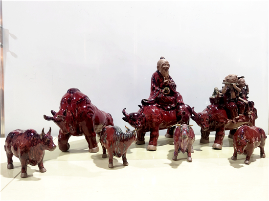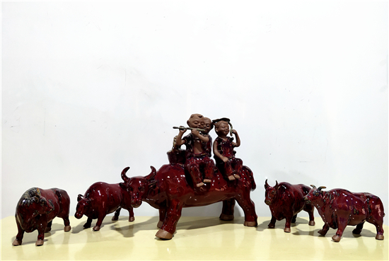 春節(jié)前夕,鄲城泥塑大師張振福歷時(shí)多日制作一組鈞瓷泥塑群雕《瑞牛賀新春》。該組作品分為三頭長(zhǎng)約90厘米的大牛和若干頭小牛,均為鈞瓷泥塑,采用豫東黃泥和粗獷手法制作,上釉時(shí)入窯一色,歷經(jīng)1200多攝氏度高溫?zé)坪蟪龈G萬(wàn)變,十分精彩。拓荒牛精神,展現(xiàn)中國(guó)人自立自強(qiáng)的志氣;孺子牛精神,體現(xiàn)在創(chuàng)造美好生活的時(shí)代課題中;老黃牛精神,貴在“心有大我、至誠(chéng)報(bào)國(guó)”的奉獻(xiàn)品格。