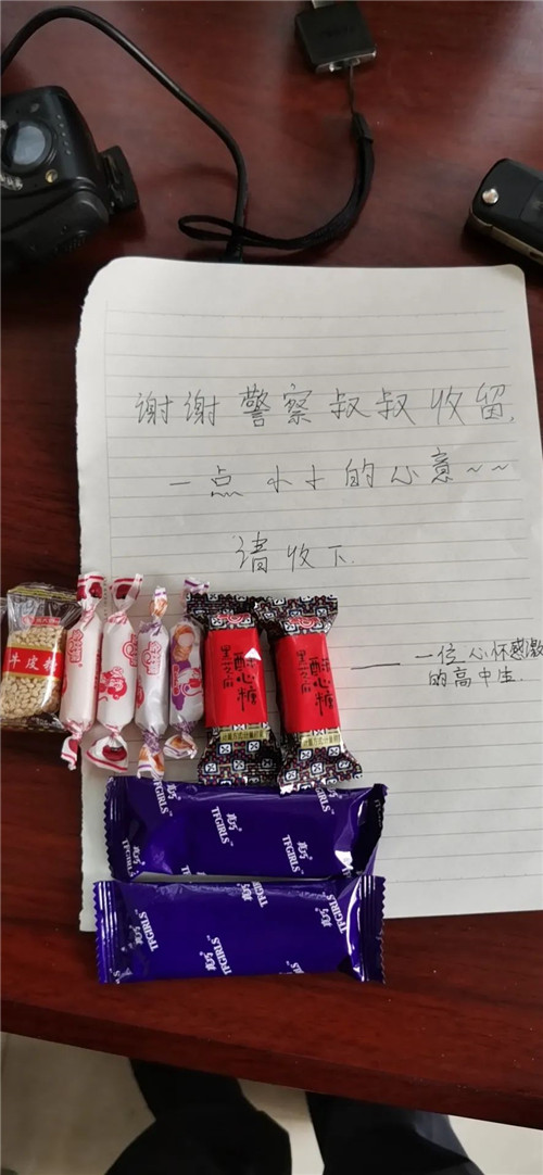 在交警忙于執(zhí)勤時(shí),女孩悄然離去,臨走前留下一封簡(jiǎn)短的感謝信和幾顆糖果。
