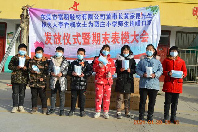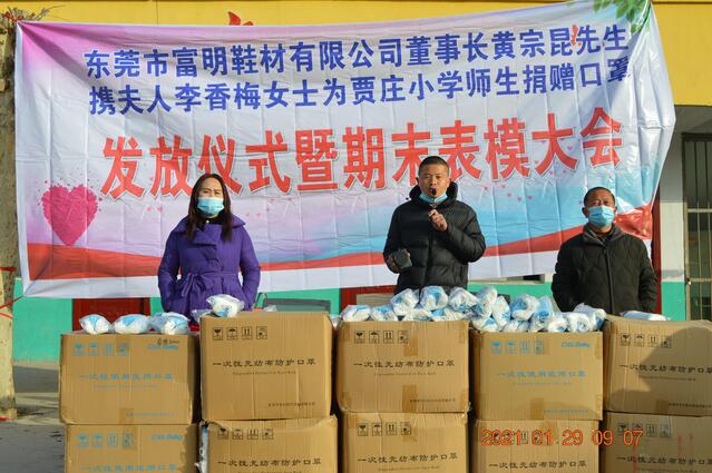 廣東省東莞市富明鞋材有限公司董事長黃宗昆先生及夫人李香梅女士原籍太康縣馬頭鎮(zhèn)薛廟村,他們得知寒假將至,正值師生、家長返鄉(xiāng)團聚、走親訪友高峰時節(jié),當(dāng)前疫情防控面臨境外疫情持續(xù)爆發(fā)流行、國內(nèi)散發(fā)病例頻發(fā)的新情況、新挑戰(zhàn)。為了確保賈莊小學(xué)300多名師生生命安全和身心健康,以及他們近期疫情防控對口罩的需求,進一步增強師生的防控意識,夫妻二人決定為該校捐贈3萬只一次性醫(yī)用口罩,以實際行動助力該校疫情防控工作。