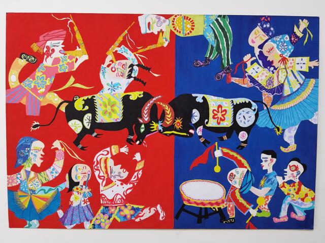 2020年4月,錢玉燕無(wú)意中看到“決勝全面小康”第二屆全國(guó)農(nóng)民畫(huà)展覽征稿啟事,對(duì)農(nóng)村生活非常熟悉的她決定一試。她立足于周口平原農(nóng)區(qū)的特色,深深領(lǐng)悟周口幾千年來(lái)的農(nóng)耕文化,對(duì)參賽作品進(jìn)行了認(rèn)真、系統(tǒng)地構(gòu)思,最終決定以歡慶豐收的斗?;顒?dòng)為題材,把農(nóng)耕文化的深遠(yuǎn)、厚重與豐富的藝術(shù)表現(xiàn)手法相融合。她采用普通的繪畫(huà)卡紙,運(yùn)用多種繪畫(huà)顏料,充分借鑒漢畫(huà)藝術(shù),吸收中原地區(qū)的剪紙文化、西方藝術(shù)大師畢加索立體畫(huà)派的藝術(shù)風(fēng)格和古埃及畫(huà)的靈感,以艷麗的紅、藍(lán)為主背景,采取夸張的表現(xiàn)手法,把斗牛的場(chǎng)景表現(xiàn)得淋漓盡致。作品創(chuàng)作發(fā)揮了豐富的想象力,人物動(dòng)物造型借鑒中國(guó)民間藝術(shù)剪紙的方式表現(xiàn),以大膽、夸張、強(qiáng)烈的色彩搭配,把無(wú)限深廣的空間“壓扁”到一個(gè)平面上。