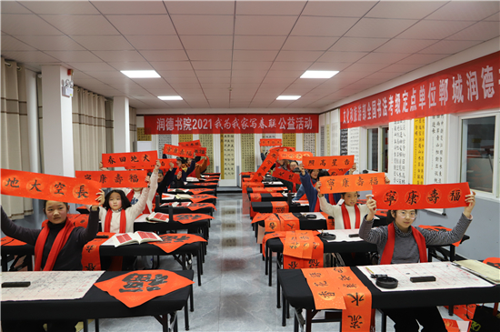春節(jié)前夕,鄲城縣的書法家和書法愛好者們便更顯活躍,他們進(jìn)機(jī)關(guān)、進(jìn)企業(yè)、進(jìn)社區(qū)、進(jìn)學(xué)校、進(jìn)農(nóng)村,把富有中國(guó)特色的新春祝福,富含中國(guó)傳統(tǒng)文化的春聯(lián),送到千家萬(wàn)戶。