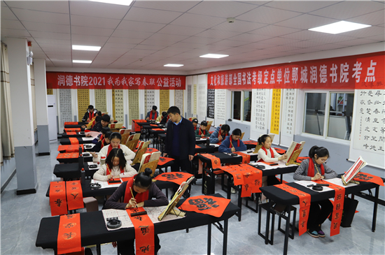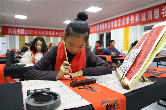 2月3日,記者在鄲城縣潤(rùn)德書院看到,“我為我家寫春聯(lián)”活動(dòng)正緊張地進(jìn)行著,數(shù)十名書法小學(xué)員端坐案前、從容執(zhí)筆、揮毫作書,一個(gè)個(gè)福字工整又靈活,一副副對(duì)聯(lián)娟秀又詩(shī)意。孩子們?cè)谖輧?nèi)全神貫注地寫字,把最美好的祝福用自己的所學(xué)展示給家庭;家長(zhǎng)們?cè)诖巴獾嗄_張望,望子成龍、望女成鳳的心態(tài)表露無(wú)遺。