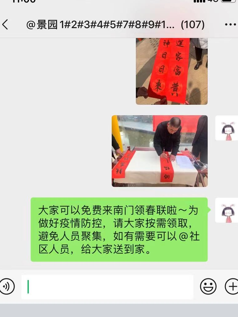 2月3日,為做好社區(qū)防疫工作,周口市城鄉(xiāng)一體化示范區(qū)景園社區(qū)一改往年現(xiàn)場寫、集中送的免費(fèi)送春聯(lián)活動(dòng)形式,把“寫春聯(lián)”與“送春聯(lián)”分開,通過微信群向社區(qū)居民展示書法愛好者的春聯(lián)作品,讓居民在線挑選,按需有序領(lǐng)取,避免人群聚集。同時(shí),針對(duì)社區(qū)老年人等行動(dòng)不便群體,主動(dòng)送春聯(lián)上門,確保送“?!迸c防疫兩不誤。