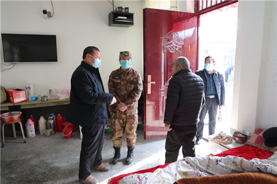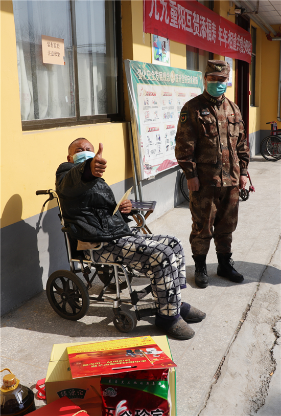 新橋鎮(zhèn)新兵楊凱入伍前和癱瘓的父親相依為命,市人武部領(lǐng)導(dǎo)協(xié)調(diào)地方政府,把其父親送到了新橋鎮(zhèn)敬老院公費(fèi)養(yǎng)老,解除他的后顧之憂。春節(jié)到了,人武部領(lǐng)導(dǎo)還牽掛著這個特困家庭,矯百成帶隊來到新橋鎮(zhèn)敬老院。此時正值中午,楊凱的父親正坐在屋外的輪椅上曬太陽,見到矯部長的突然到來,激動的眼含熱淚,他緊緊握住矯百成的手久久不愿松開。矯百成噓寒問暖,給他送上1000元慰問金和生活必需品,楊凱的父親用他那不太清晰的語言表達(dá)對部長的真誠感謝。在敬老院院長的帶領(lǐng)下,矯百成又來到老人的住室察看起居情況,詢問他平時生活狀況,當(dāng)?shù)弥先松畹暮苁娣r,矯百成滿意的笑了。