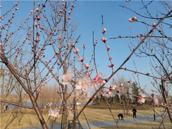 下午3點(diǎn),陽光透著溫暖,許多市民在草地上或躺或坐,孩子們手里牽著風(fēng)箏,嬉笑追逐,幾株桃花被早春的氣息撞了一下,羞赧地開著,垂柳露著嫩綠的芽兒,在風(fēng)中舞動(dòng)。