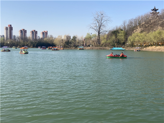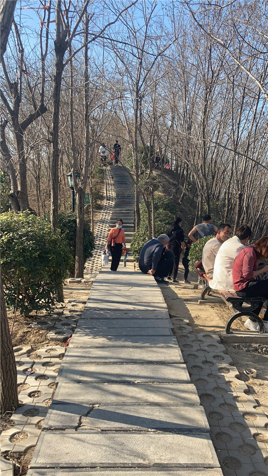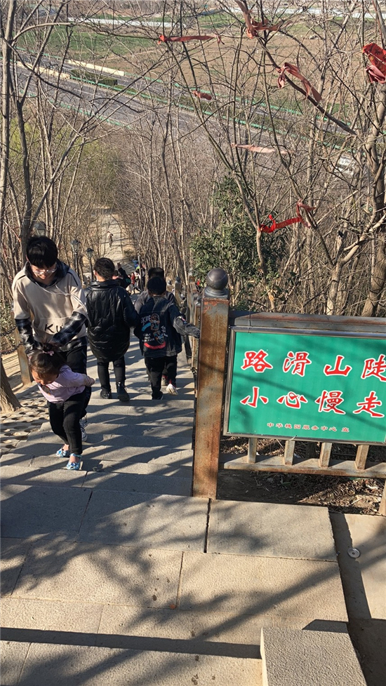 在槐香湖邊,年輕人三五結(jié)伴登上游艇,“坐船能到湖那邊的小島,島上也有槐樹,拍照肯定特別漂亮?!狈掂l(xiāng)大學(xué)生把七星島上的景色留在了自己的相機里。七星島與槐香湖相連的橋上,人潮擁擠,有的人席地而坐,觀賞著橋上的風(fēng)景。當(dāng)問道在外市工作的王先生游玩感受時,他回答到:“年后上班沒時間鍛煉身體,今天我把全家人帶來登山,呼吸一下新鮮空氣?!雹?