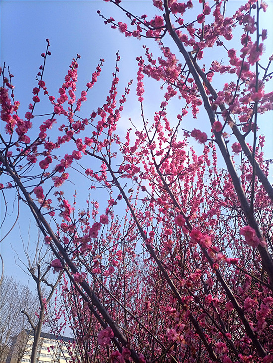 梅花,自古以來就是文人墨客筆下的??汀S性娫疲骸按猴L試手先梅蕊,頩姿冷艷明沙水?!泵坊軌蛄韬㈤_,兼具冷艷和嬌媚,被譽為花中四君子之首。近日,我市天氣晴好,公園內(nèi)、道路旁,一樹樹梅花開的熱熱鬧鬧、密密匝匝,令人感受到濃濃的春意和無盡的美好。