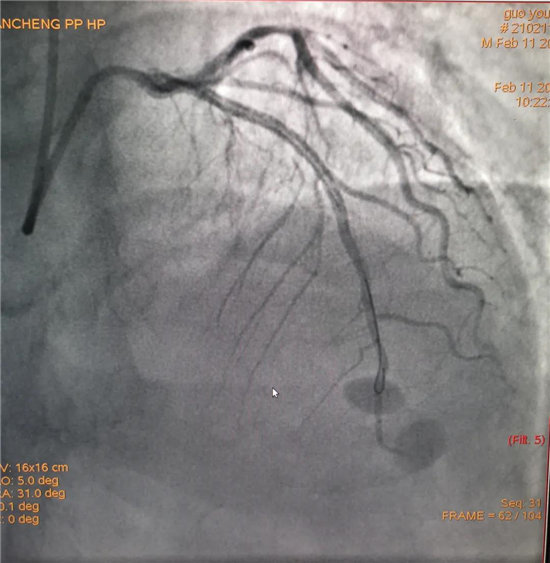 除夕,郭先生無明顯誘因突發(fā)胸痛,120急救人員到達(dá)現(xiàn)場,心電圖顯示:竇性心律完全性束支傳導(dǎo)阻滯。信息立刻發(fā)送到胸痛中心介入微信群中,心內(nèi)科值班醫(yī)生初步診斷為急性廣泛前壁心肌梗死,必須盡快進(jìn)行急診支架治療,開通血管。值班醫(yī)生電話指導(dǎo)院前治療,并立即啟動(dòng)胸痛綠色通道,24小時(shí)備班的介入治療團(tuán)隊(duì)立即到位,9:30患者被送到導(dǎo)管室行冠脈介入診療,9:40急診PCI手術(shù)隨之開始,冠脈造影檢查提示左前降支閉塞,植入支架,堵塞的血管被順利打通,患者癥狀緩解,手術(shù)非常成功,10:20患者被送往病房進(jìn)一步治療。