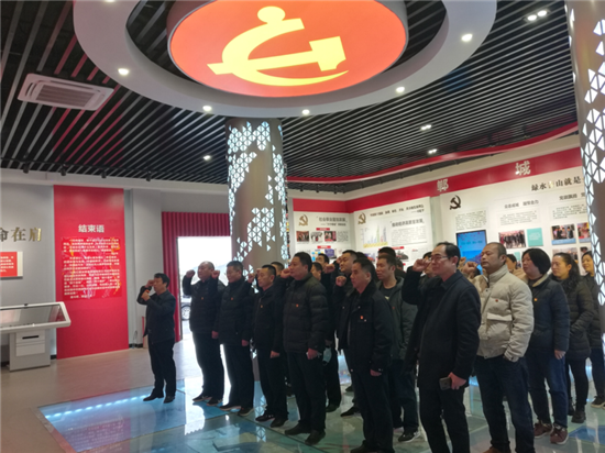 在宣誓臺前,全體黨員干部面對鮮紅的黨旗,高舉右手莊嚴宣誓,重溫入黨誓詞。