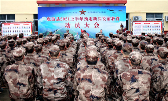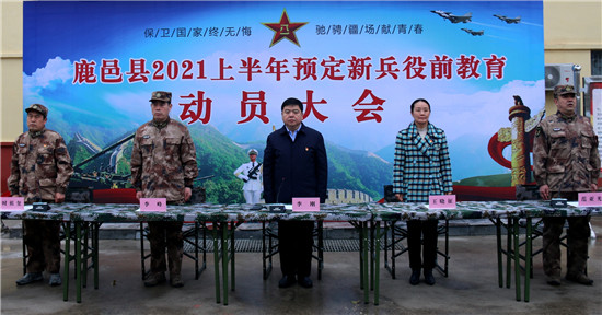 3月1日上午,河南省鹿邑縣在民兵訓練基地召開2021年上半年預定新兵役前教育訓練動員大會,縣委書記、縣人武部黨委第一書記李剛,縣委常委、副縣長王曉征,縣人武部部長范亞光、 政委李峰、副部長時祖奎,以及全體預定新兵和教練員骨干共240人出席會議。會議由縣人武部政委李峰主持。