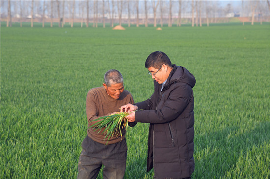 3月3日,商水縣黃寨鎮(zhèn)農(nóng)技人員在察看小麥長勢。近日,我市普降小到中雨,旱情解除,土壤墑情改善,有利于冬小麥起身返青,為農(nóng)業(yè)豐收打下基礎(chǔ)。周口日報(bào)·周道客戶端記者 付永奇 攝