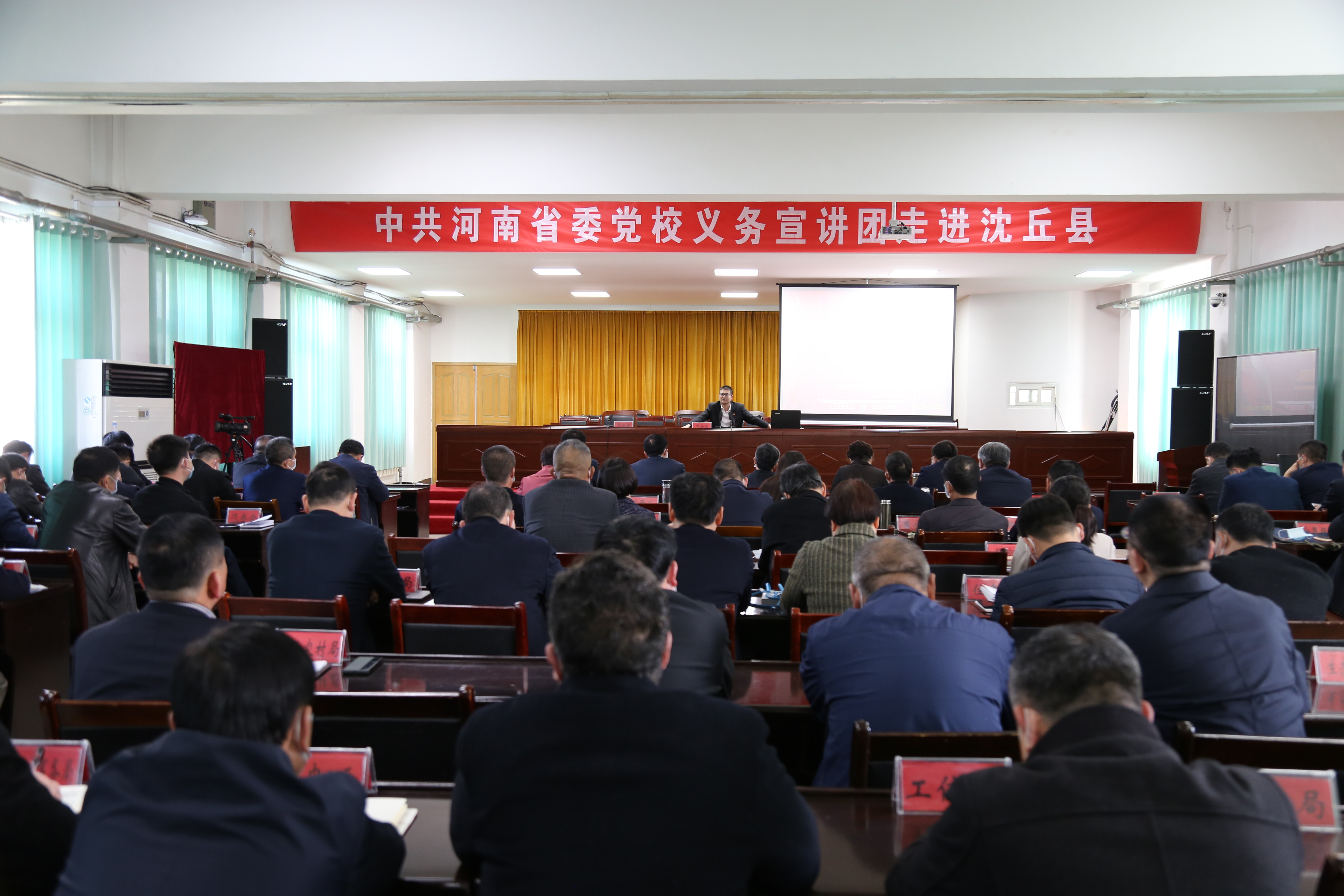 3月25日下午,中共河南省委黨校義務(wù)宣講團(tuán)走進(jìn)沈丘縣開(kāi)展宣講活動(dòng)?;矢α⑿隆①Z慶偉、殷曉春、趙振、郝四春、劉和輝、呂孝坤等在家的縣四個(gè)班子領(lǐng)導(dǎo)及副處級(jí)以上干部與全縣近200余名黨員干部共同聆聽(tīng)了宣講報(bào)告??h委副書(shū)記賈慶偉主持報(bào)告會(huì)。