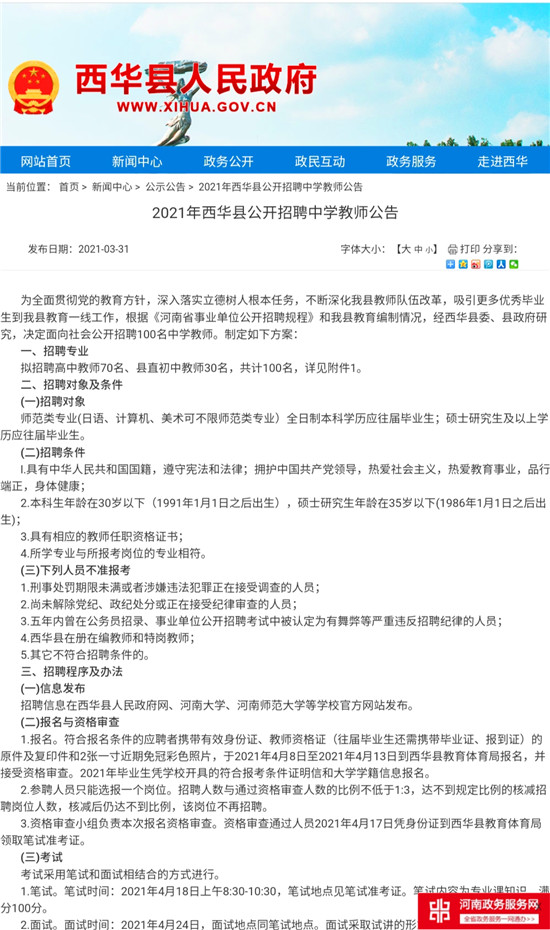 4月8日,記者從西華縣人民政府網(wǎng)站獲悉,為全面貫徹黨的教育方針,深入落實(shí)立德樹人根本任務(wù),不斷深化西華縣教師隊(duì)伍改革,吸引更多優(yōu)秀畢業(yè)生到西華教育一線工作,根據(jù)《河南省事業(yè)單位公開招聘規(guī)程》和西華縣教育編制情況,經(jīng)西華縣委、縣政府研究,決定面向社會(huì)公開招聘100名中學(xué)教師。