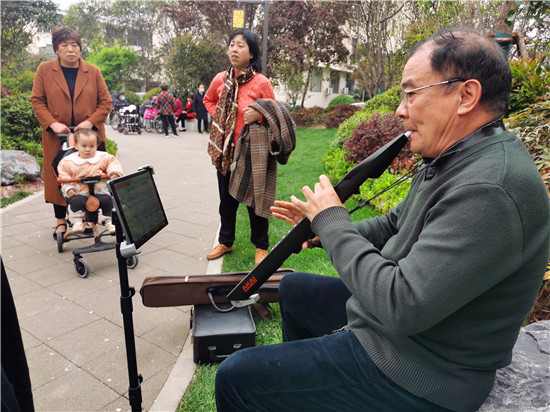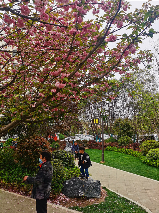 4月12日,中心城區(qū)文明路與七一路交叉口的街頭游園內(nèi),櫻花盛開,綠坪如茵,老人們?cè)谧詩首詷?,很是幸福愜意?/p>