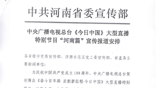 中央廣播電視總臺(tái)《今日中國(guó)》大型直播特別節(jié)目“河南篇”宣傳報(bào)道安排