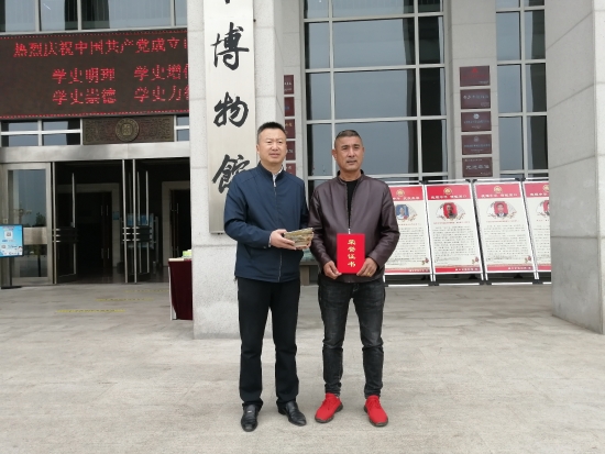 4月25日,周口市博物館收到周口市文昌辦事處李莊社區(qū)村委委員趙團(tuán)結(jié)向捐贈(zèng)的兩件唐代黃釉瓷碗,該文物對(duì)周口漕運(yùn)史具有研究?jī)r(jià)值。周建山館長向趙團(tuán)結(jié)頒發(fā)收藏證書,并感謝他對(duì)周口考古工作的支持。
