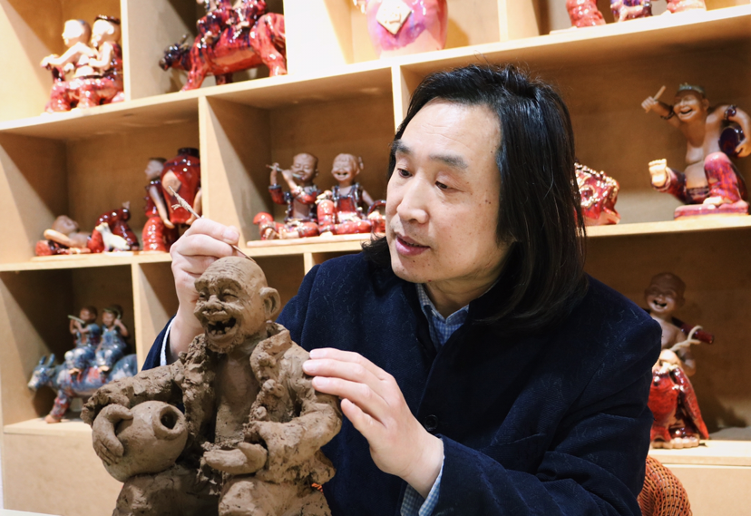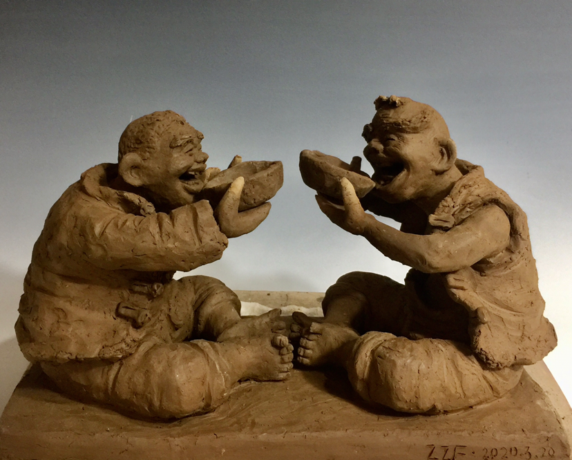 隨后,張振福又介紹了近期創(chuàng)作的慶祝中國共產(chǎn)黨成立100周年紅色主題泥塑《征途漫漫》《長在黨旗下》《淮海戰(zhàn)役》《一個蘋果的故事》等。李尚武贊賞張振福泥塑風(fēng)格獨特、主題鮮明,傳遞了正能量,作品具有思想性、藝術(shù)性,充滿鄉(xiāng)情味、泥土味。