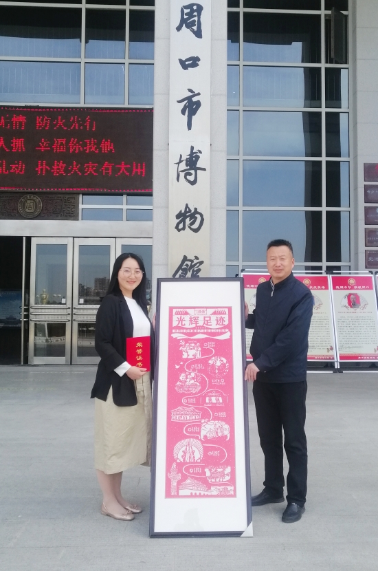 4月28日,河南科技職業(yè)大學(xué)老師范文華來到周口市博物館,將自己的剪紙作品“光輝足跡”捐贈給周口市博物館,在建黨100周年之際,表達(dá)一位教育工作者的殷殷之情。周口市博物館館長周建山向其頒發(fā)榮譽證書。