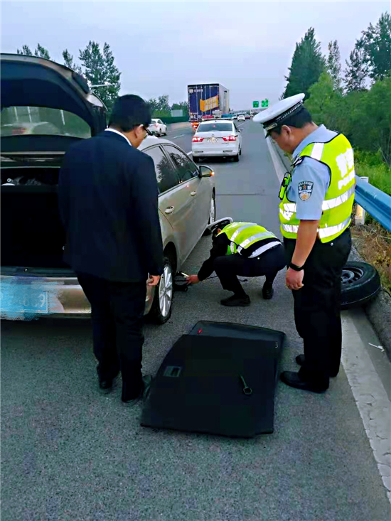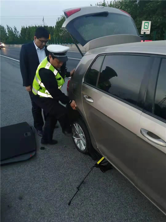 5月2日19時(shí)許,市公安局交通管理支隊(duì)高速二大隊(duì)項(xiàng)城中隊(duì)(以下簡(jiǎn)稱高速二大隊(duì)項(xiàng)城中隊(duì))民警由北往南方向巡邏途中,行駛到2081公里附近西半幅處,發(fā)現(xiàn)一輛轎車因車后輪爆胎,被迫停在應(yīng)急車道,民警隨即幫助該車主更換車載備胎,解決了司機(jī)的燃眉之急。