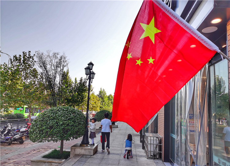 9月30日,市區(qū)臨街商鋪門前五星紅旗隨處可見,紅旗隨風飄揚,將街道裝扮一新,喜迎國慶節(jié)的到來